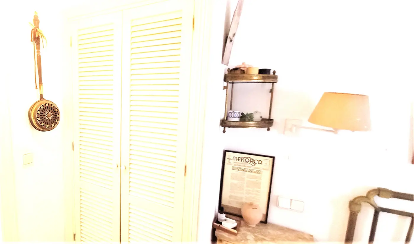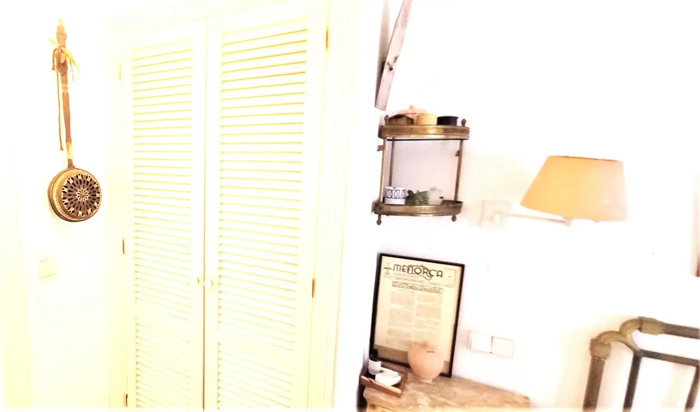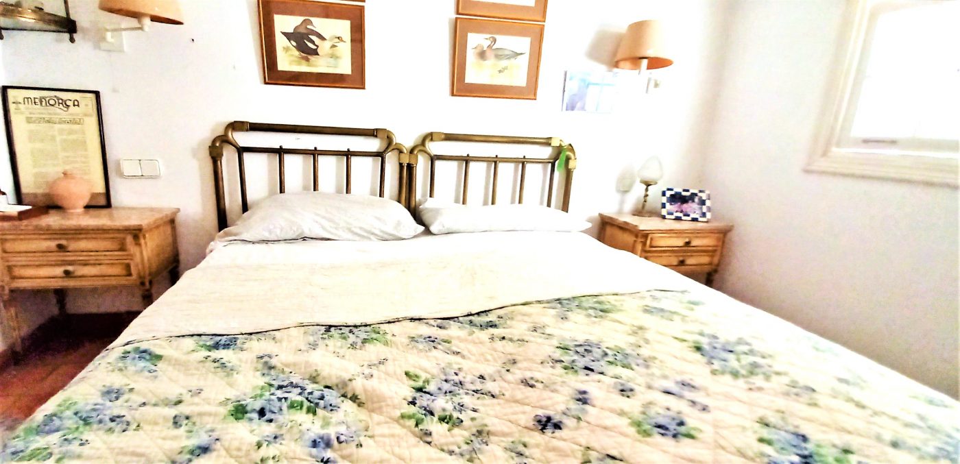 Der Zugang zum Doppelhaus erfolgt entweder über die Haupttür oder durch die Garage. Im ersten Stock erwartet Sie ein sehr großzügiges und lichtdurchflutetes Wohn-Esszimmer, das mit großen Fenstern ausgestattet ist und einen herrlichen Ausblick auf den Hafen von Mahón bietet. Zudem gibt es eine unabhängige, ausgestattete Küche mit Zugang zu einem kleinen Innenhof, ein vollwertiges Badezimmer, ein Schlafzimmer mit Doppelbett und eigenem Bad sowie ein Einzelzimmer.