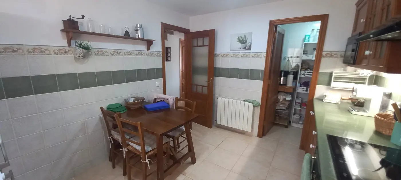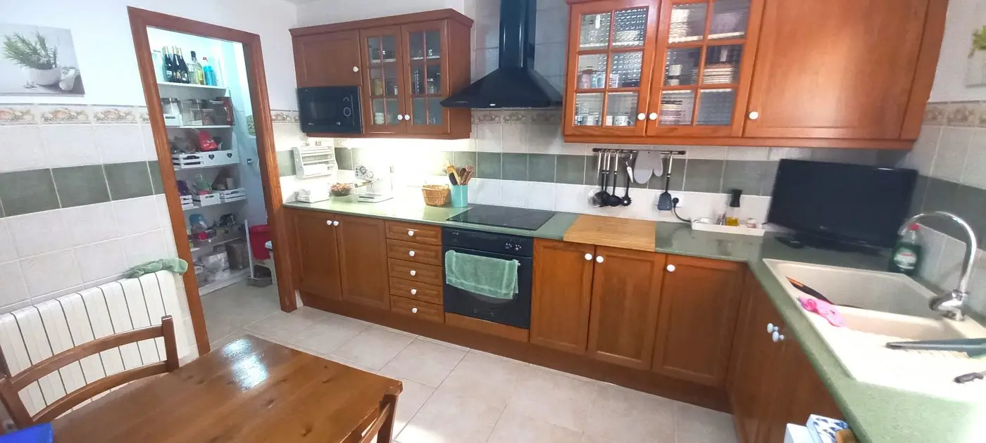 Im Erdgeschoss betreten Sie eine einladende Diele, gefolgt von einer großzügigen separaten Küche, die ausreichend Platz für einen Esstisch bietet. Die Küche ist mit grünem Silestone und Eichenmöbeln ausgestattet und verfügt über eine praktische Speisekammer sowie ein Gäste-WC. Das Wohnzimmer ist lichtdurchflutet durch große Fenster, die auf eine Terrasse und den Pool blicken. Der Pool ist isoliert, sodass Sie auch warmes Wasser genießen können. Der Außenbereich der Terrasse ist mit einem Grill ausgestattet, der sich hervorragend für gesellige Zusammenkünfte mit Freunden und Familie eignet.