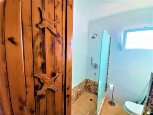 Das offene Konzept, das Wohnzimmer, Esszimmer und Küche harmonisch vereint, vermittelt sofort ein Gefühl von Weite und Gemütlichkeit. Eine charmante Schräge führt zu drei geschmackvoll gestalteten Schlafzimmern, darunter ein großzügiges Doppelzimmer mit eigenem Bad und Ankleideraum – der perfekte Ort, um sich nach einem langen Tag am Strand zu entspannen.
